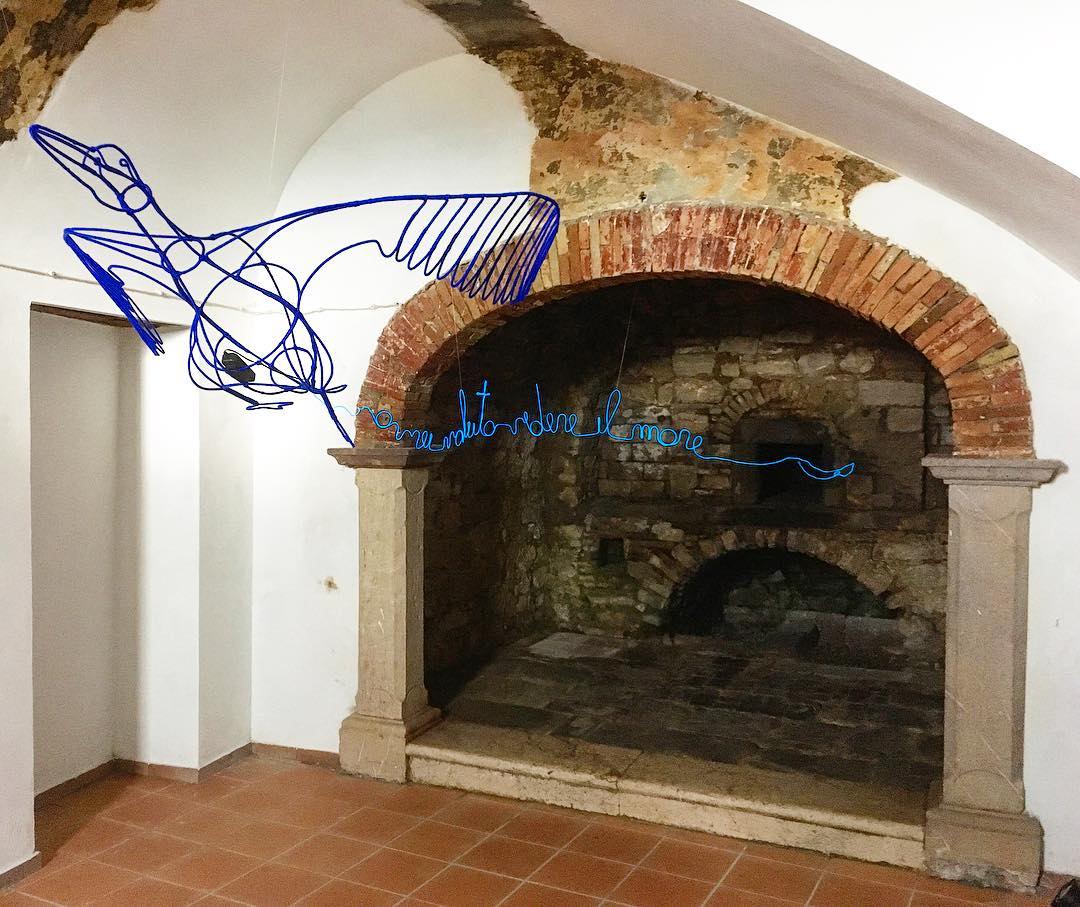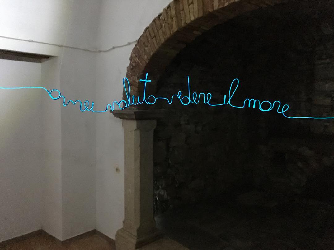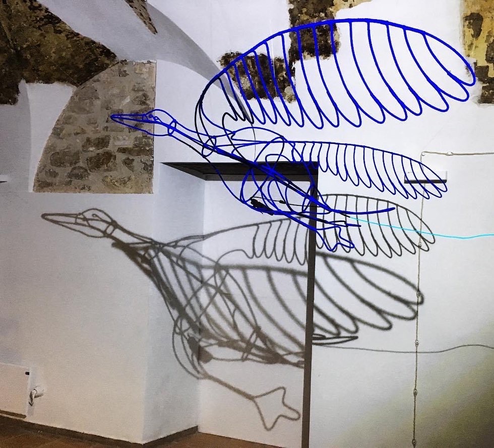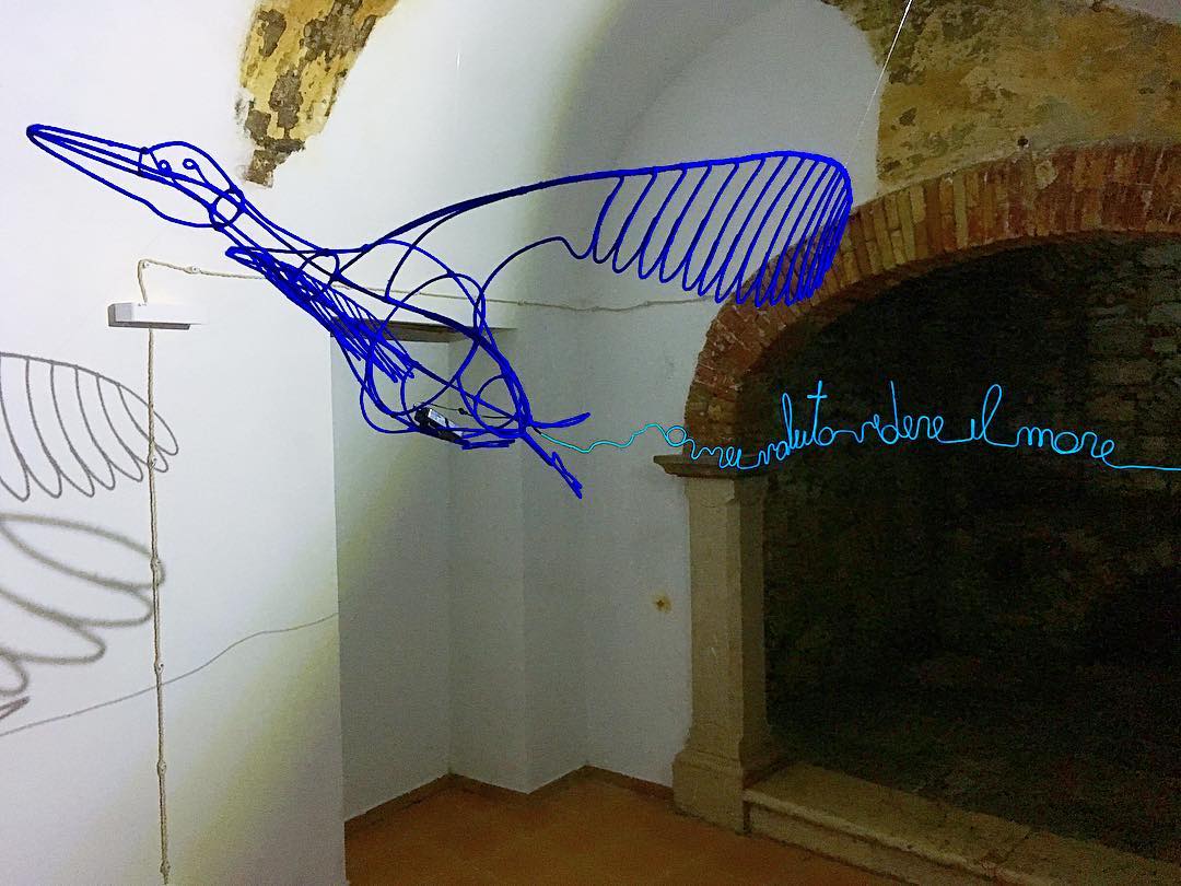 Un gabbiano blu, chiuso in una stanza, balza fuori da un vecchio camino. Alla ricerca della libertà, tenta la fuga verso il suo habitat naturale, non più il mare, ma ormai la grande città. Un filo di fibra fuoriesce dall’ano del volatile e traccia una scritta aerea che recita: “avrei voluto vedere il mare”. Guano è l’escremento degli animali marini, che nell’installazione si intreccia in una frase dal forte significato, come un grido di aiuto.