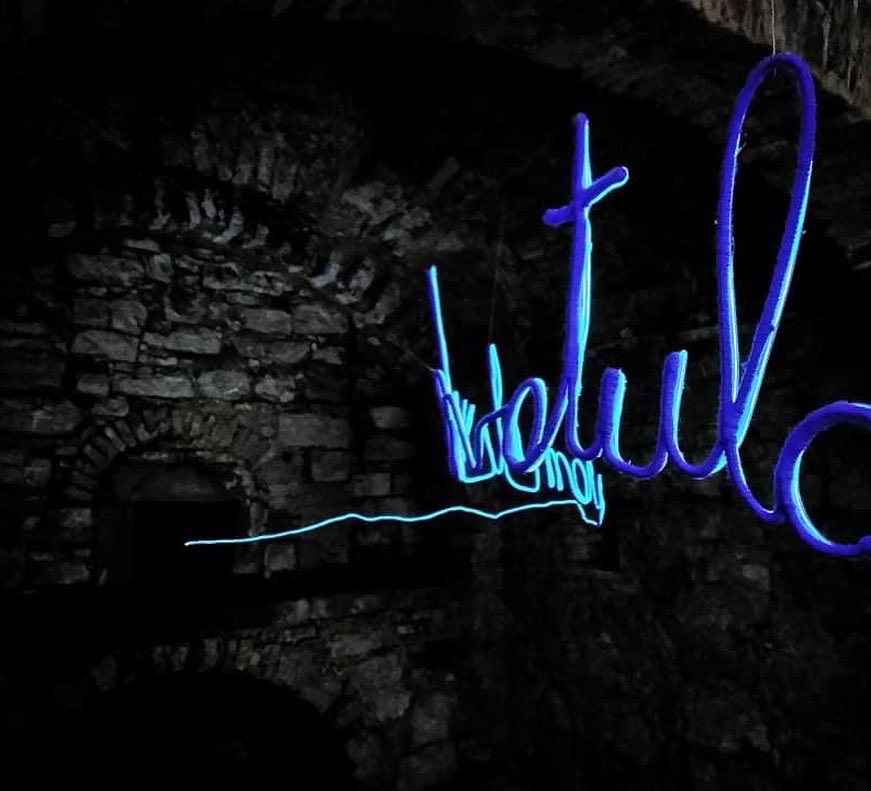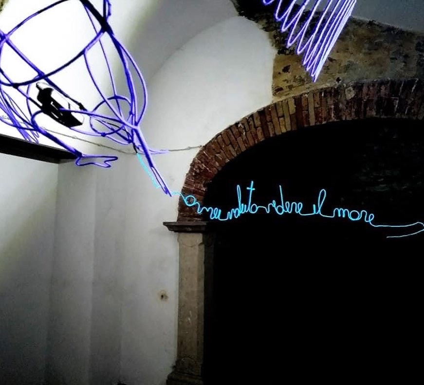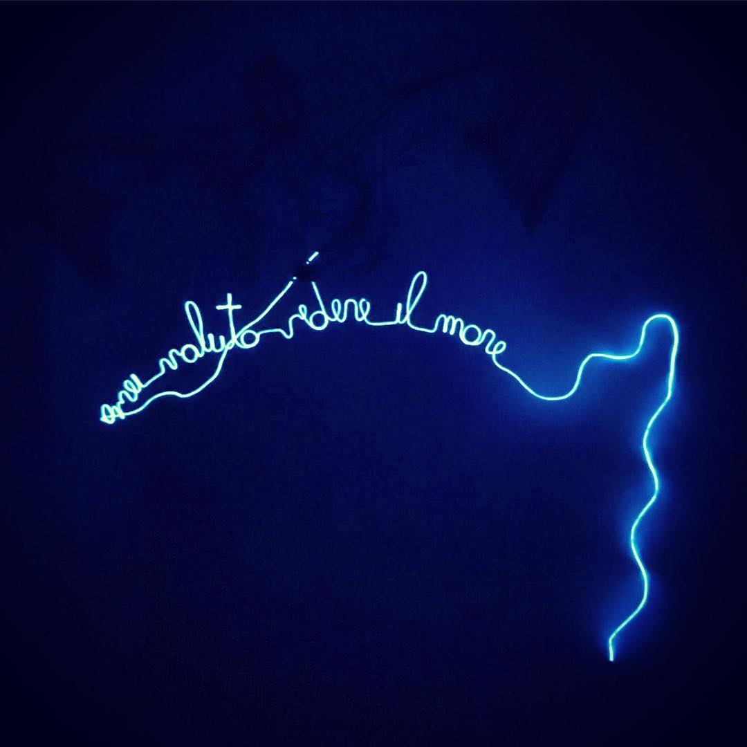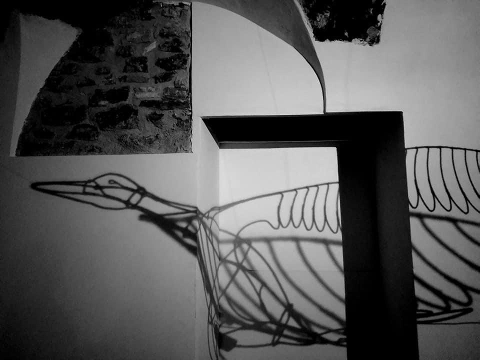 Un gabbiano blu, chiuso in una stanza, balza fuori da un vecchio camino. Alla ricerca della libertà, tenta la fuga verso il suo habitat naturale, non più il mare, ma ormai la grande città. Un filo di fibra fuoriesce dall’ano del volatile e traccia una scritta aerea che recita: “avrei voluto vedere il mare”. Guano è l’escremento degli animali marini, che nell’installazione si intreccia in una frase dal forte significato, come un grido di aiuto.