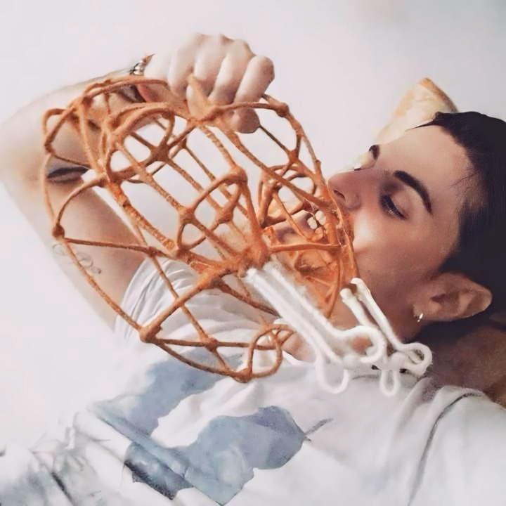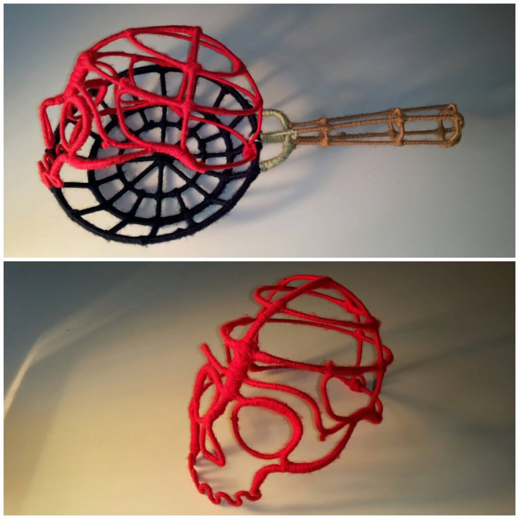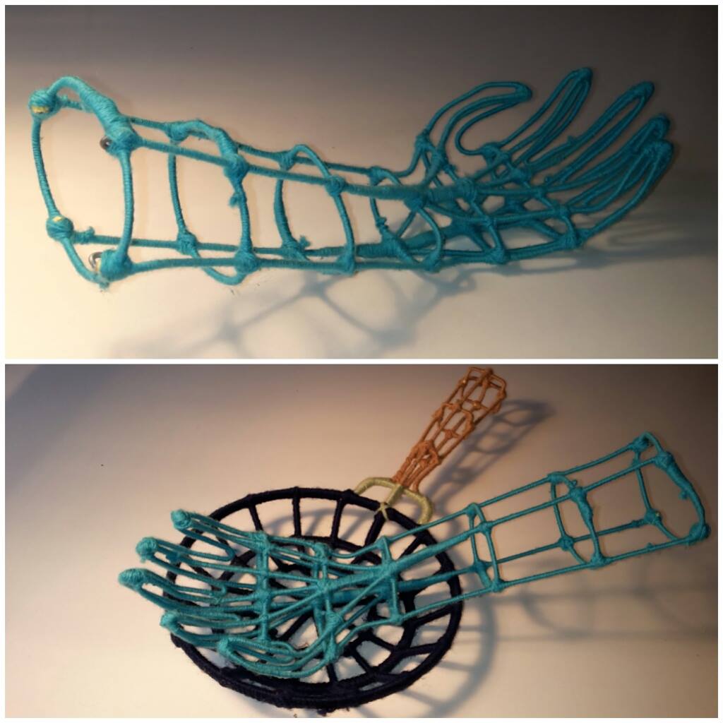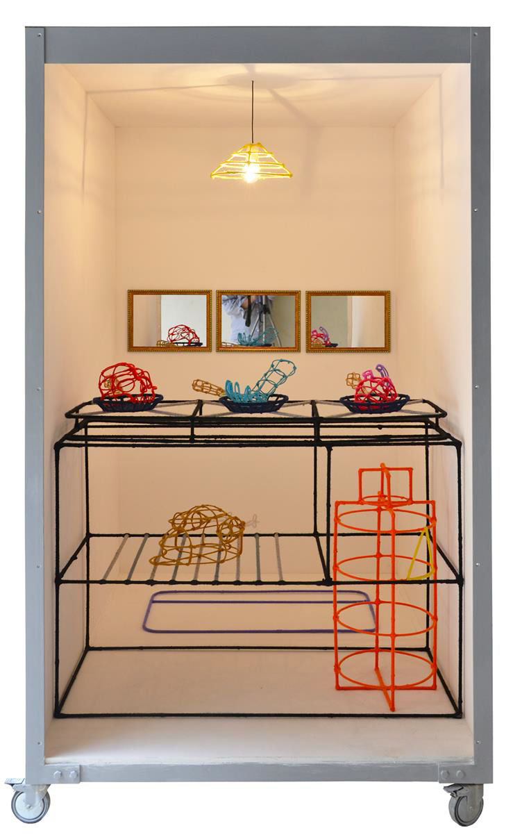 Sui fornelli sono poste tre padelle contenenti rispettivamente un teschio, una mano e un cuore. Nel piano sottostante fa bella mostra di sé un pollo con a fianco la bombola del gas. L’ambiente è illuminato da una lampadina che pende dal soffitto e completato da una serie di specchi a parete. La particolarità di quest’opera consiste nell’aver avvolto in modo minuzioso la struttura, utensili e cibo con fili di lana di colore diverso, descrivendo in modo “grafico” volumi e corpi vuoti. Se da un lato in quest’opera è evidente la parodia alla moda del momento e cioè lo street food, dall’altro la presenza di cuore, teschio e mano tagliata rimanda ad un immaginario trash proprio del mondo creativo punk e underground.